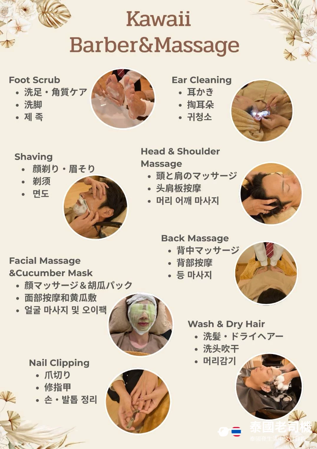 Kawaii Barber & Massage 提供越式理髮風格的刮鬍、頭肩按摩、腳部磨砂等多項組合服務,價格為 ฿600 – ฿1,700,視乎服務的時長和所選的房間類型。店裡只提供純綠色服務,不含半套或全套服務。