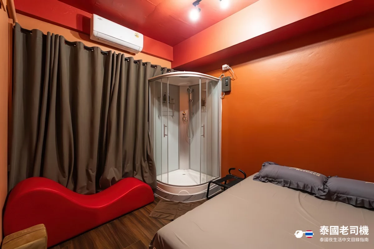 Red House Massage 共有 4 層,一樓大廳頗為寬敞,二樓為挑選女孩的地方,三樓和四樓為房間。店裡除了有一般淋浴設備和按摩浴缸外,還有教室和醫院的情景主題房間,不過較為「土炮」,只是用道具裝飾佈置,並沒有在裝潢上投資太多。值得一提的是,店裡有 SM 主題的房間,對此感興趣的兄弟也可以考慮。