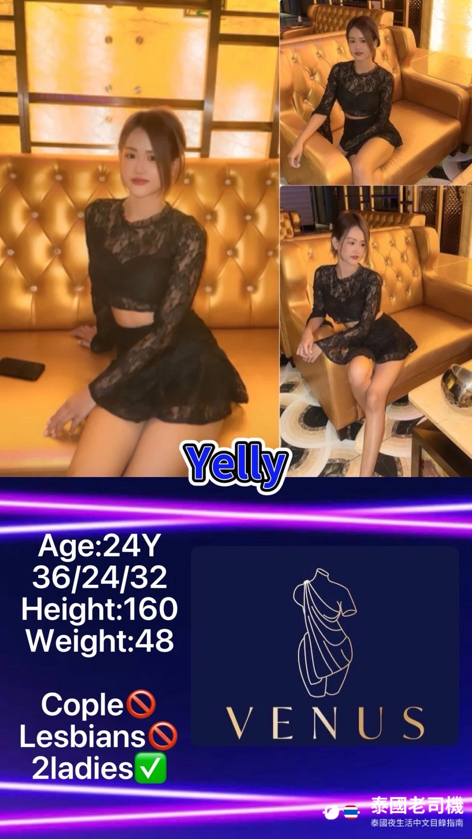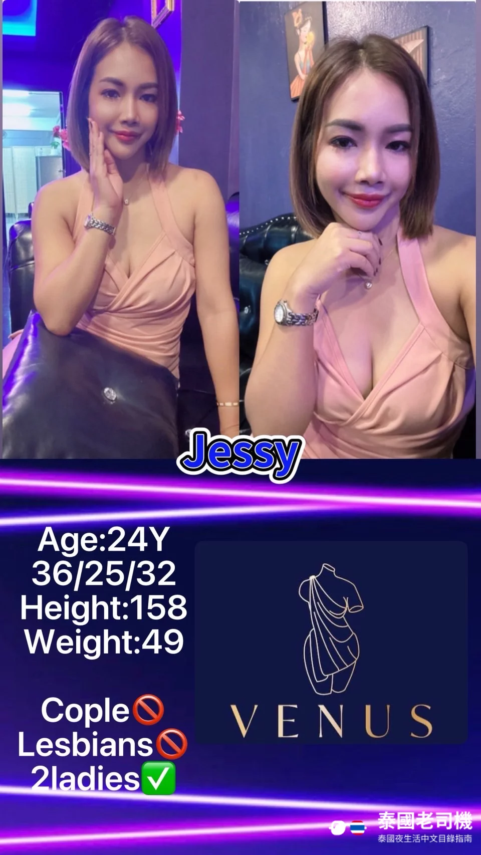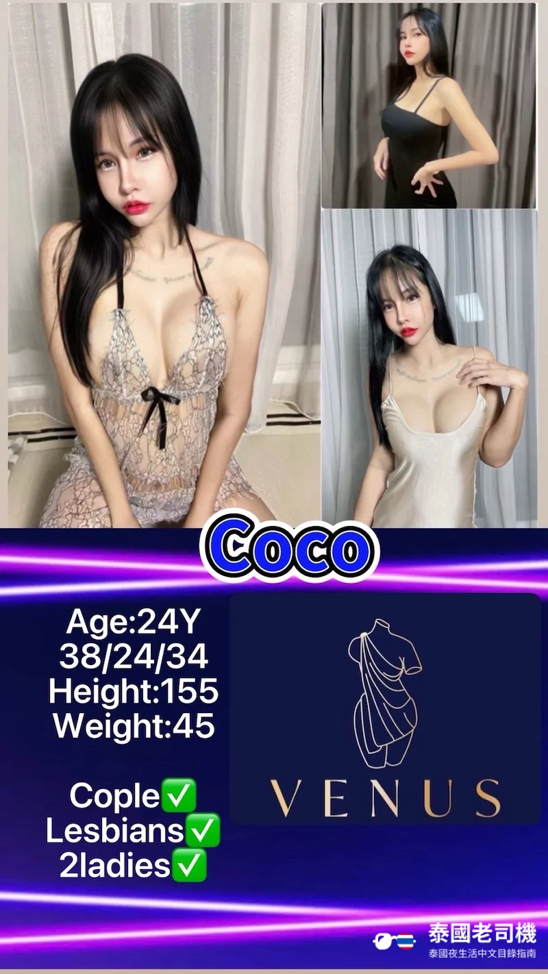Venus Massage 的設施包括按摩房及按摩浴缸,服務包括精油按摩及 Nuru 按摩,另提供雙飛服務及上門服務。收費範圍從 ฿1,800 – ฿7,500 不等,具體價格根據服務時長及類型而定。值得一提的是部分女孩可以服務情侶和女同性戀顧客,詳情可以向客服查詢。